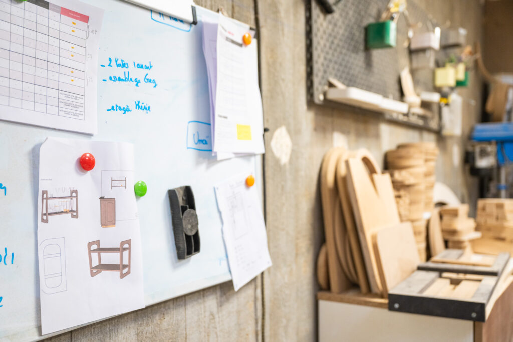 Nouveaux plans, l’atelier s’agrandit et s’installe sur 230 m² : de quoi stocker le bois, installer le nouvel espace nécessaire à l’activité de Corentin, le bureau de Mélissa et préparer les objets de petite décoration pour les commandes !