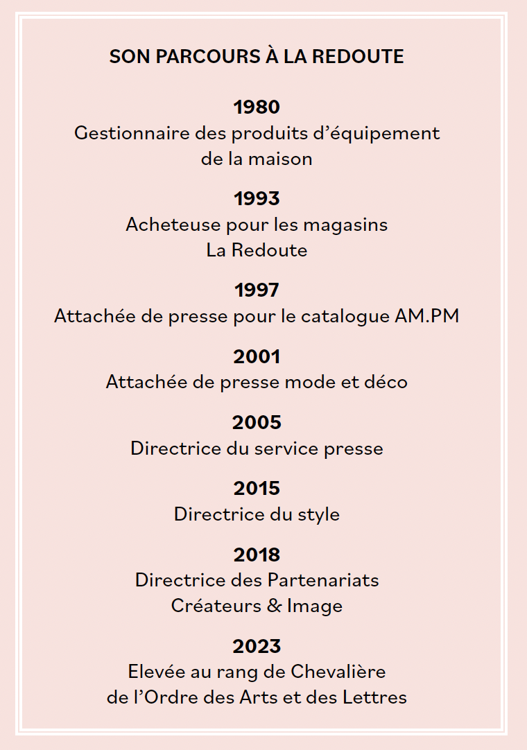 Quand elle dirigeait le service presse avant 2015, Sylvette a commencé à ouvrir les armoires riches de tous les catalogues La Redoute, dont le premier qui date de 1928. À la même époque elle retrouve des courriers de clientes, des témoignages de femmes qui ont partagé une histoire avec La Redoute. En parallèle, elle plonge dans les vestiaires d’archives afin de retracer les 56 ans de création avec des grandes maisons, des jeunes pousses, des marques émergeantes… « Cette expérience m’a permis de renouer avec des collections étonnantes, des objets singuliers ». Un travail titanesque qui lui a fait prendre conscience de l’importance du rôle sociétal de l’entreprise, de son attachement à demeurer auprès des familles et à investir leur foyer.