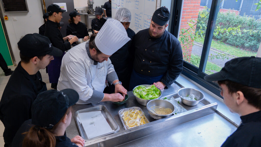 C’est dans une ambiance studieuse mais joyeuse que la journée commence. Ici pas de craie, ni de tableau noir. Seulement le crépitement des plaques, les couteaux qui glissent sur les planches et les consignes des chefs Vins et Losfeld.